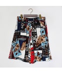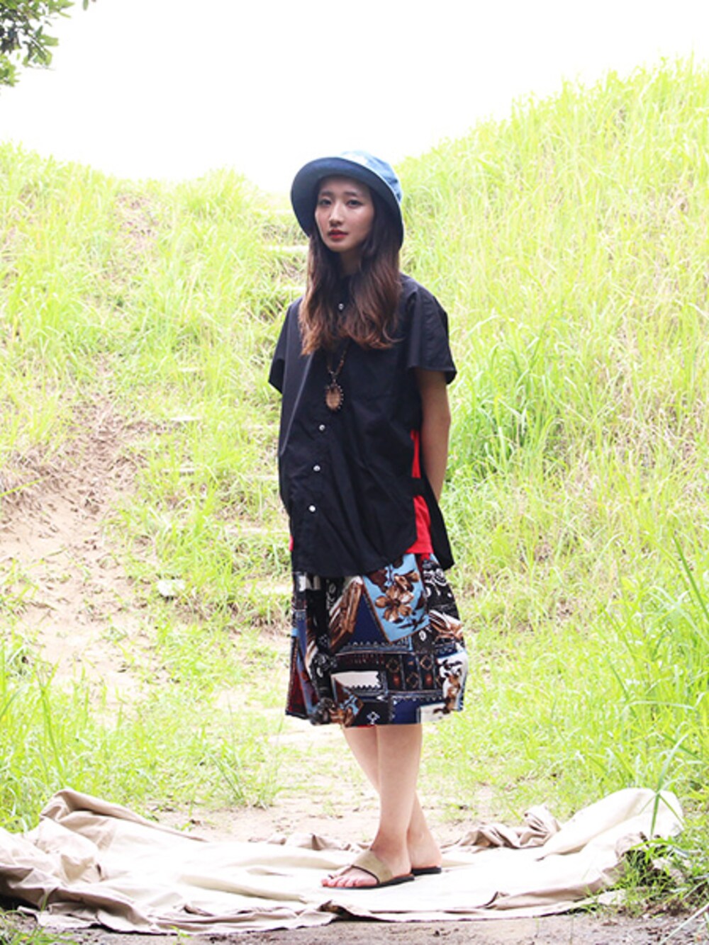 夏としては少し落ち着いた雰囲気のトップスですが、両サイドが空いているので差し色のようにインナーを見せるようにしています。赤と黒、、妖艶。 パンツはビッグシルエットの柄パンツでトップスとは裏腹に浮かれた感じです。独特のシルエットのビッグショーツは女性がはくとスカートのようにも見えるので一石二鳥のお得感。