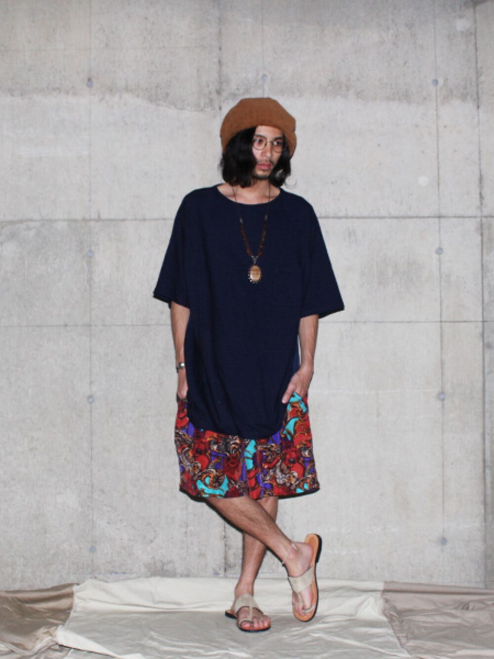 オーバーサイズのトップスは一見シンプルですが、後ろ身頃に大胆なレオパード柄の切り替えがされたユニークなアイテム。フロントと同色系のレオパード柄なので、パンツに柄ものを合わせてもうるさくなりません。 浮かれた色合いのショートパンツは古着。古着ならではのテロテロした生地感と軽さ、独特のカラーバランスが魅力のショートパンツ。 こんなショーツがはけるのもの夏のうち。。