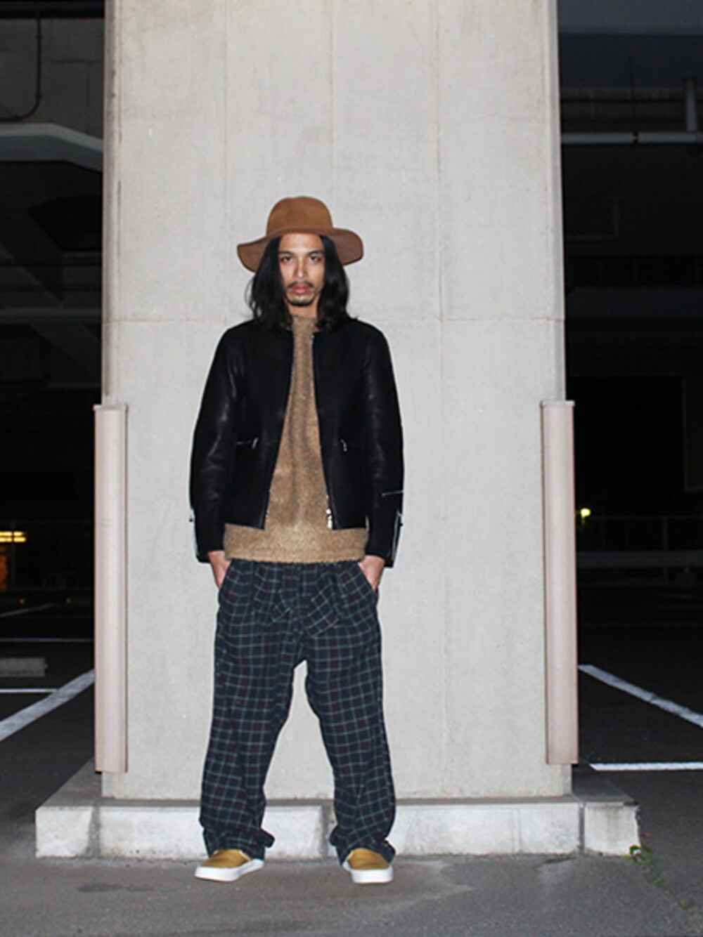 なかなか手強く、普段敬遠しがちなオールインワン(つなぎ)ですが、タータンチェック柄のカジュアルなものであれば意外と簡単に着こなせてしまいます。 これはオールインワンの上半身を垂らして袖の部分を腰で結んだスタイル。シャツを巻いてるような表情になり、いつものコーディネートにプラスαを与えてくれます。 下半身がカジュアルなので、上半身にレザージャケットを合わせてハードな雰囲気を与えてみました。ただ、ノーカラーなのでハードになりすぎずいい塩梅。パーカーを合わせてもいいかも。