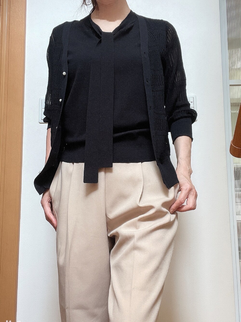 先週買ったGUのリボン付きニットのコーデバリエーションです。 黒×ベージュが結構好きなので、ベージュのパンツに合わせてます。 ピンクベージュのサンダルが合いそう。 カジュアル過ぎずきちんと感もあるコーデです💕 今回はGUで買った服のコーデなのでほぼGUです😅 カーディガンとリボン付きニットは今期もの。 パンツは昨年か一昨年かな?😳