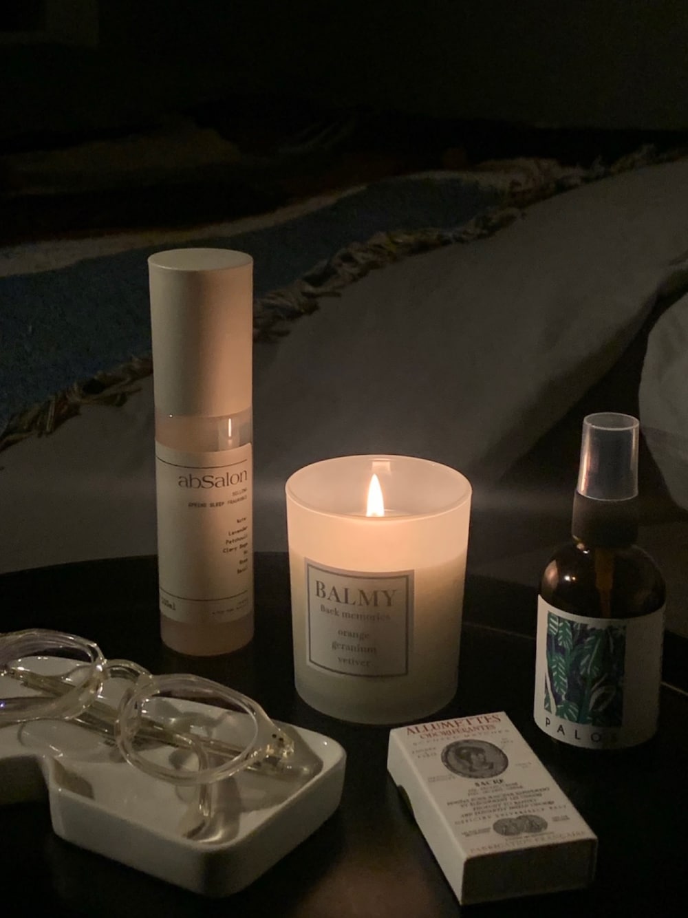 最近の寝るまえの香りアイテム😪 ウッディな香りをキャンドルもスプレー使ってます👍 落ち着いた気分になれてオススメ!
