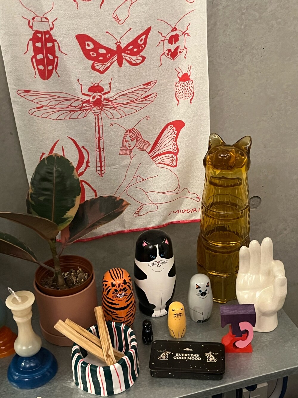 カラフルなお気に入りコーナー🫶 猫のおっきいのはほんまはスタッキングカップなんですが、インテリアにしても可愛いです🐈✨
