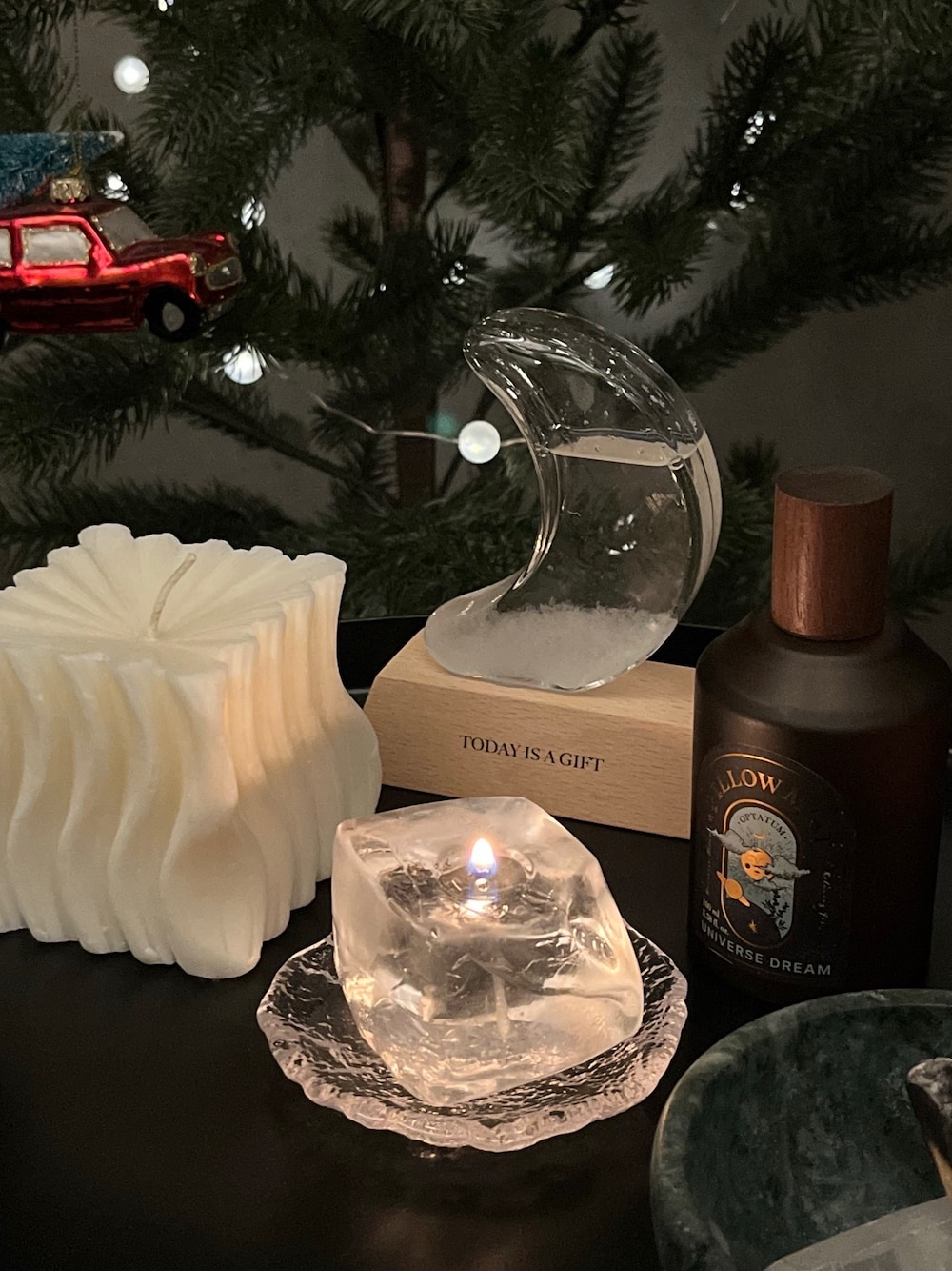 BIRTHDAY BARの可愛いアイテム合わせたら素敵空間になった🫶 おしゃれな形のキャンドルは 香りも良くて飾るだけで一気におしゃれ空間になります!✨ ストームグラスとOPTATUMのピローミストの相性良すぎる🌙 透明のキャンドルもオシャレすぎてお気に入りです✌️