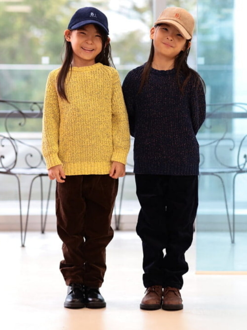 【Model:119cm】6歳年長の双子の女の子。ニット、パンツ、キャップ共に色違いの双子だからこそできるペアコーデ。イエロー系とネイビー系、それぞれのコーディネートのカラーバランスも相まって仲良し感も倍増。見ているこちらも笑みがこぼれるスタイリングです。