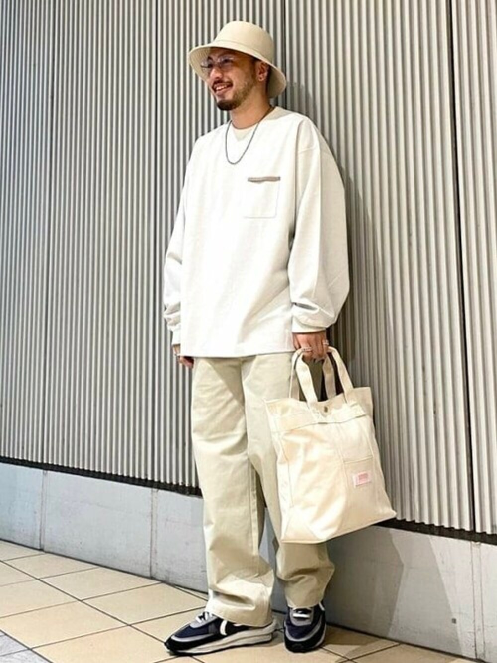 ご覧いただき有難うございます! 全身をオフホワイトでカラーコーディネート!足元に少量のブラックを差し込む事で引き締めました。被っているハットはレディースで展開しているアイテムです!雰囲気が良く、大きめサイズなので男性にもオススメ! 毎日スタイリングを投稿していますので、気に入っていただいた方はいいね!とフォロー!をお願いします!!★モデル:173㎝
