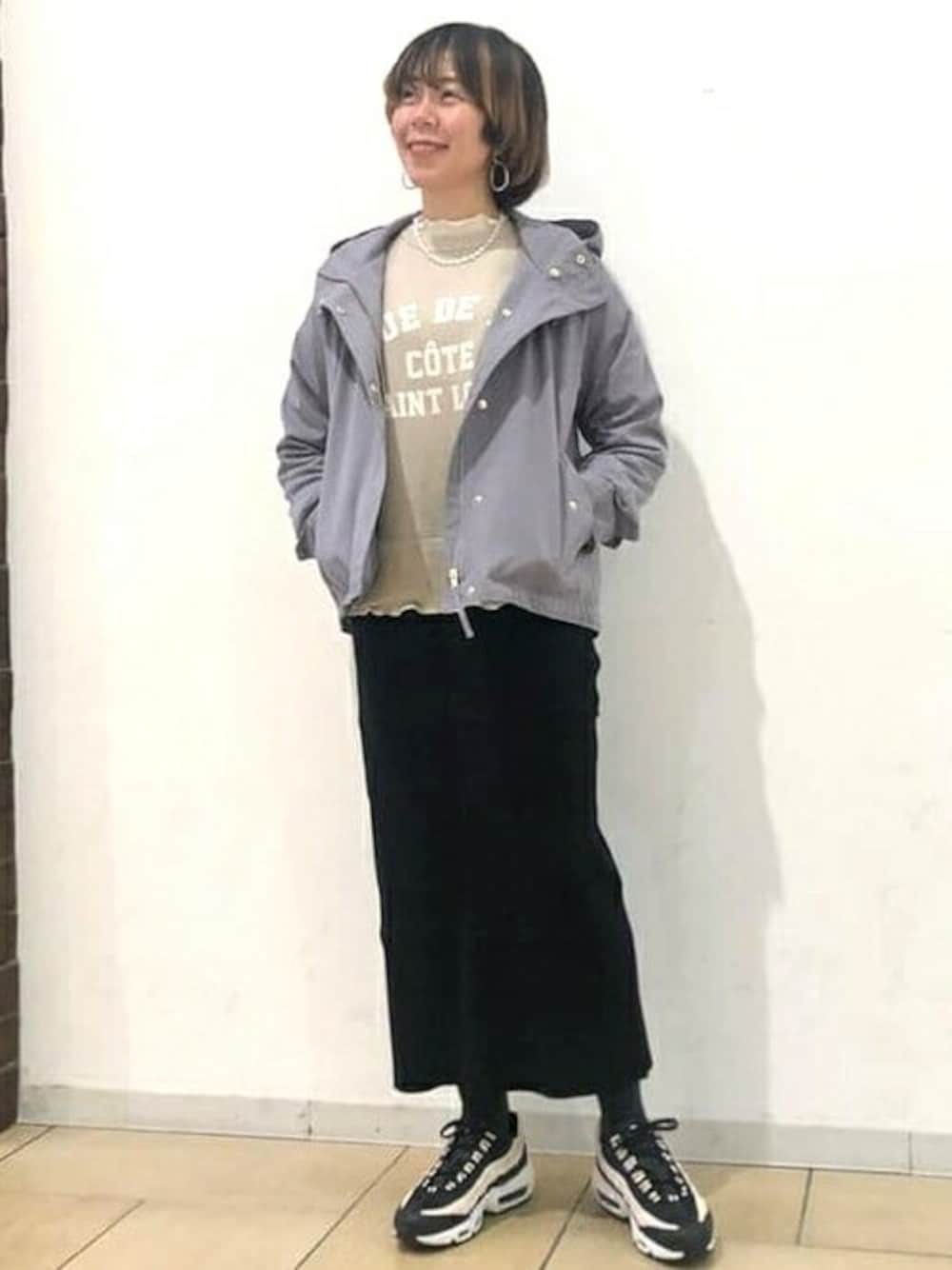 マウンテンパーカー×スウェット×スニーカーのカジュアルスタイルに、1つ女度UPアイテムとしてタイトなスカートを合わせました。 適度なフィット感で、トップスのサイズ感とボリュームスニーカーとのバランスがとれます。 コスパ抜群の定番マウンテンパーカーは、新色のパープルが新鮮でとってもおすすめです!!