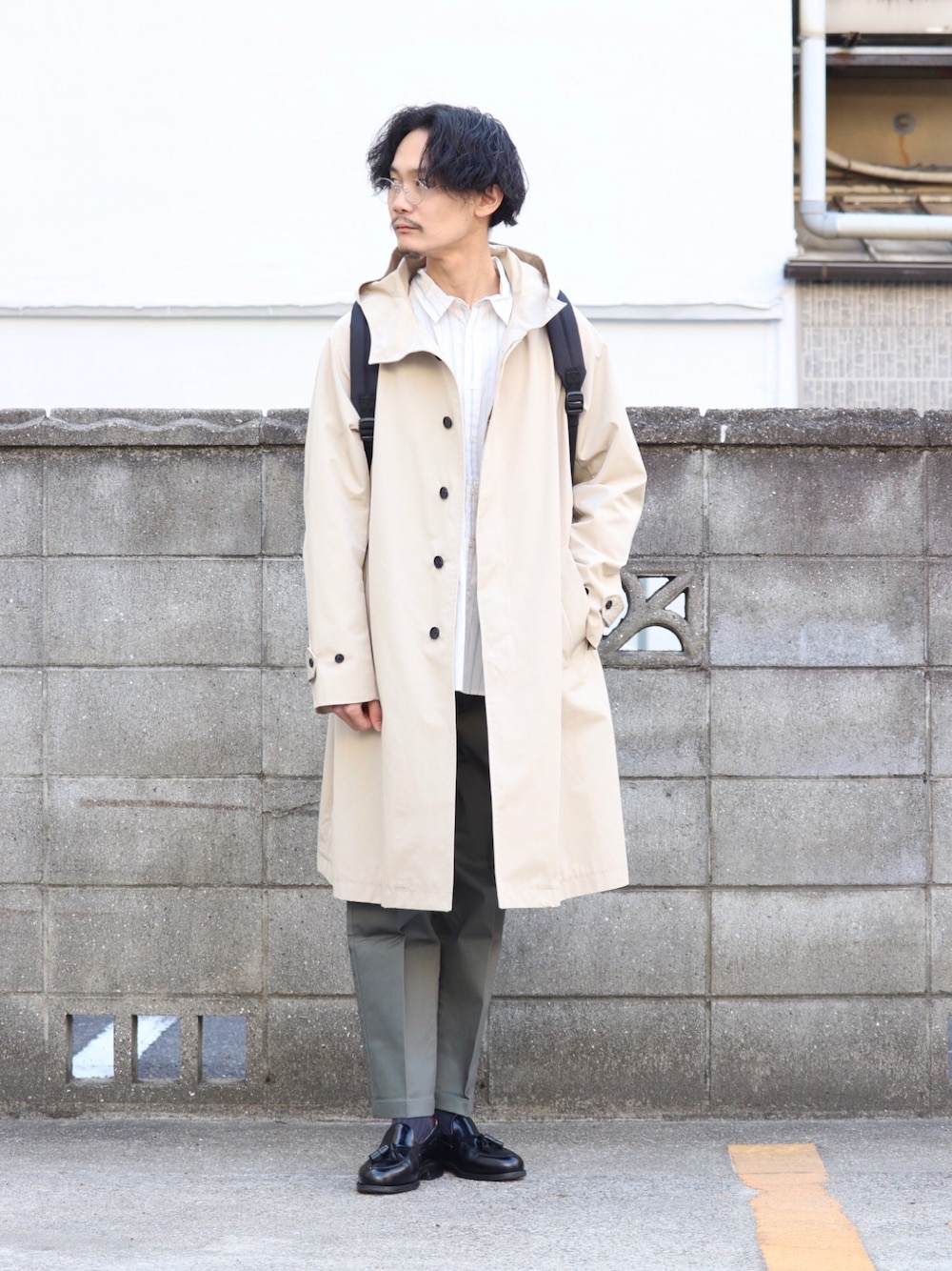 ベージュのフードコートにストライプシャツと春らしさを出してみました