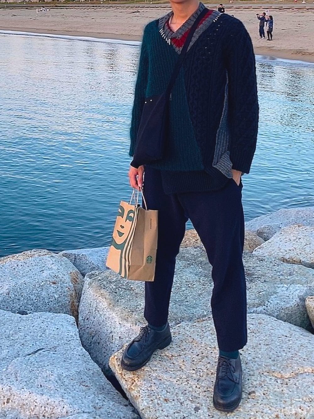 いつもご覧いただきありがとうございます😊 テーパードパンツとクレイジーニットでシンプルにまとめてみました。靴下の色はニットのブルーグリーンと同じ色のものを履くことでまとまりを出しています。 テーパードパンツは足元が綺麗にまとまるのでおすすめです!