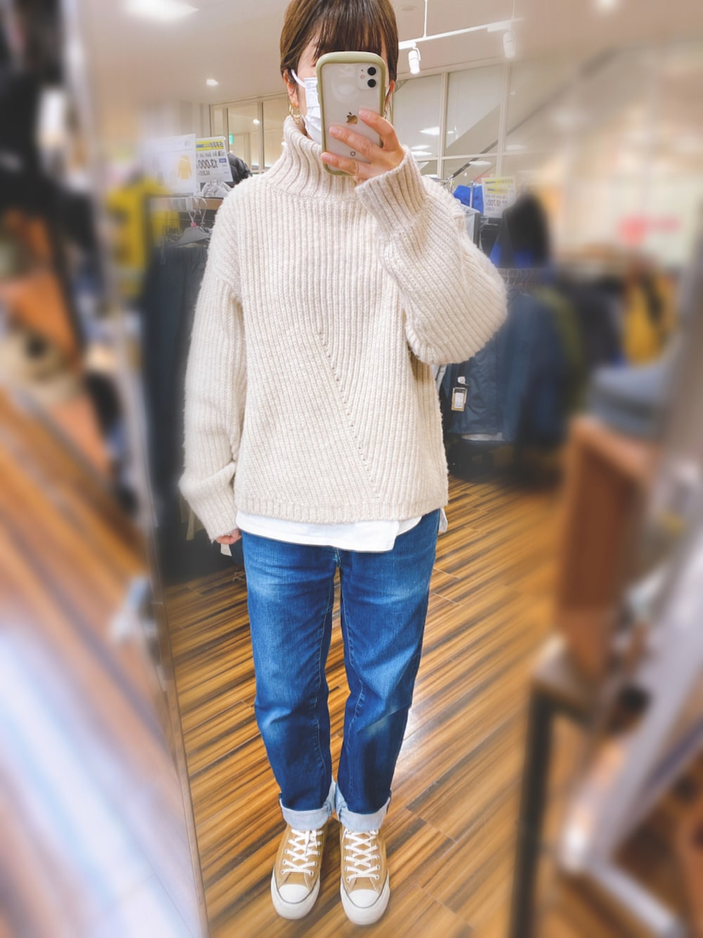 旦那さんのお古のユニクロデニムがお気に入りです♡ ニットは最近見つけた物¨̮♡⃛ シルエットと着心地が気に入ってます。