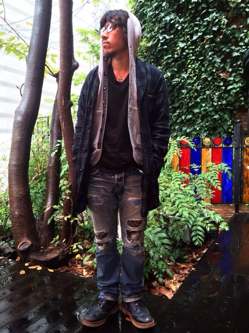名古屋パルコにて。 ミドリのジャケットにパーカーを合わせました。 名古屋は寒いし雨です。