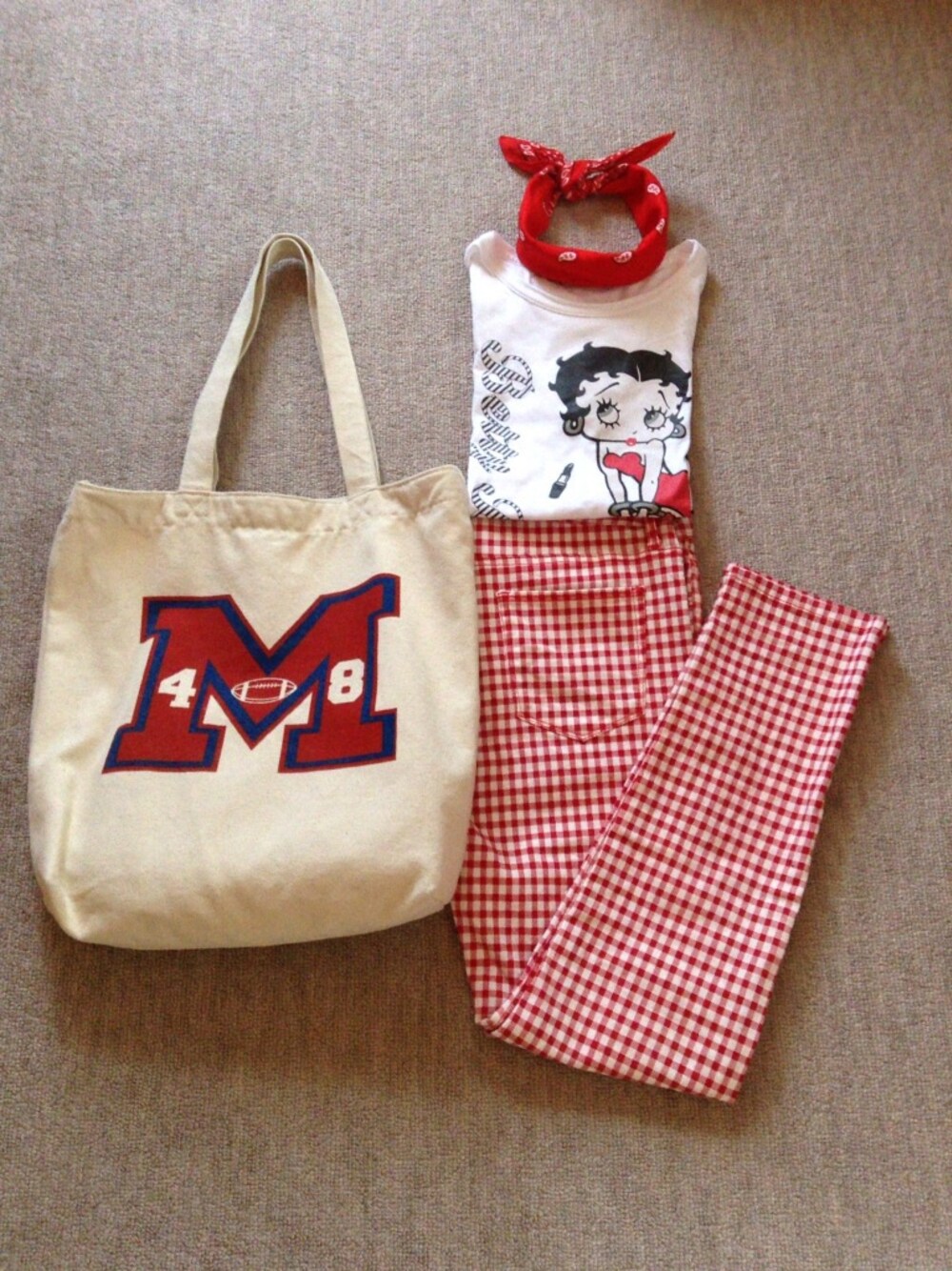 今日も暑いです☀︎ 暑いけど 赤がいっぱい☺︎ Tシャツ→地元のイオン ズボン→ローリーズファーム カバン→WEGO バンダナ→おふる