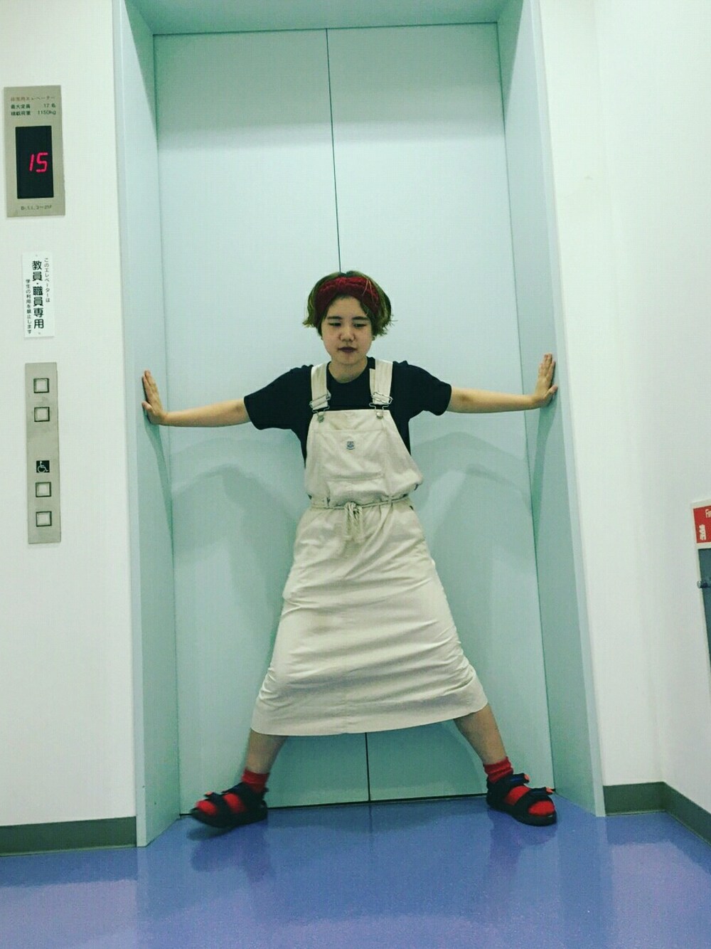このオーバーオールワンピースは普通に着ると身長が低いのでバランスが悪いのですが、ウエストに麻の紐を巻き、前当てを少したるませることでバランスをよくしています👌