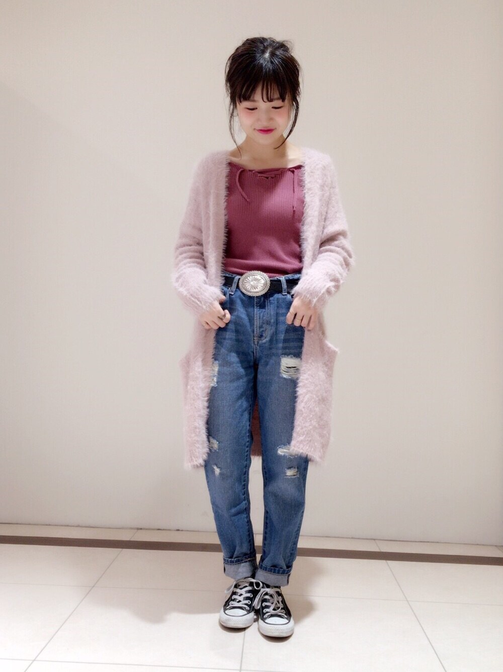 ピンク×デニム 甘くなりすぎずダメージデニムで🍥