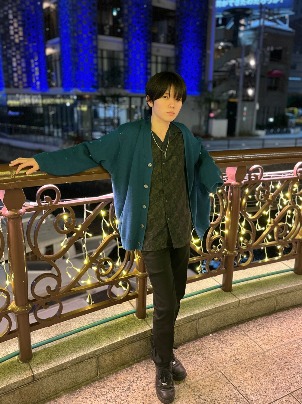 ADRERのカーディガンとドルマンスリーブオープンカラーシャツでコーディネートしました。 夜の中洲の雰囲気にとけこむおしゃれな感じに仕上げてみました。 胸元が少し広めに開くところがちょっとセクシー。低身長でも大人っぽく見せることができると思います。 カーディガンの可愛さとシャツのカッコ良さ ほんのりカジュアルときれいめを織り交ぜた絶妙なバランスのコーデです。 パンツとシューズをブラックに揃えて足長効果を使っています。黒スキニーはダサいという風潮がありますが、低身長の人こそタイトなパンツで身長を高くみせた方がいいコーデになると思います。