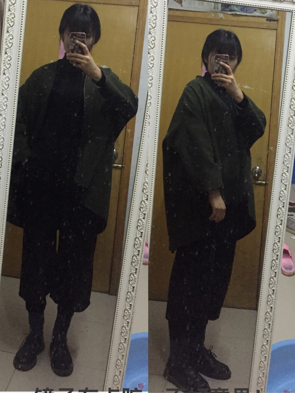 内搭黑色毛衣 裤子是七分裤 搭配有趣的长袜子和休闲英伦鞋 外套是宽松的军绿色开衫 再配上砖红色等复古色口红 就是穿越来的人啦嘻嘻 还有,最后一点很重要,镜子脏啦,明天就擦! 冬天要多穿点,揪咪~ 开启学日语模式!