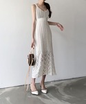 爽やかな透かし編みのタイトニットワンピース。 Vに切り込んだ衿ぐりでデコルテ周りはすっきりを見え! 基本のストライプ見えする編みと裾部分はジグザグ編みになっており シンプルシルエットを引きたてます♪ カーディガンやジャケットを羽織って 日々のコーディネートにもお使いいただけますが これからの季節のお家コーデにもピッタリです♪ ニット素材なので締め付け感もなく 快適にご着用いただけます。
