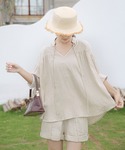 ナチュラル素材のゆったりシルエットのチュニックトップス。 衿元と袖口カフスにはヒモが付いていて、 縛ればリボンデザインになり可愛らしい雰囲気に◎ 胸元と袖にはしっかりをギャザーが入っており ふんわりとボディラインをカバーしてくれます! スタンドカラーと幅が広めのカフスでメリハリをプラス。 ※別売りのダブルヘムピンタックショートパンツとセットアップの着こなしができます。
