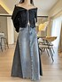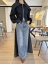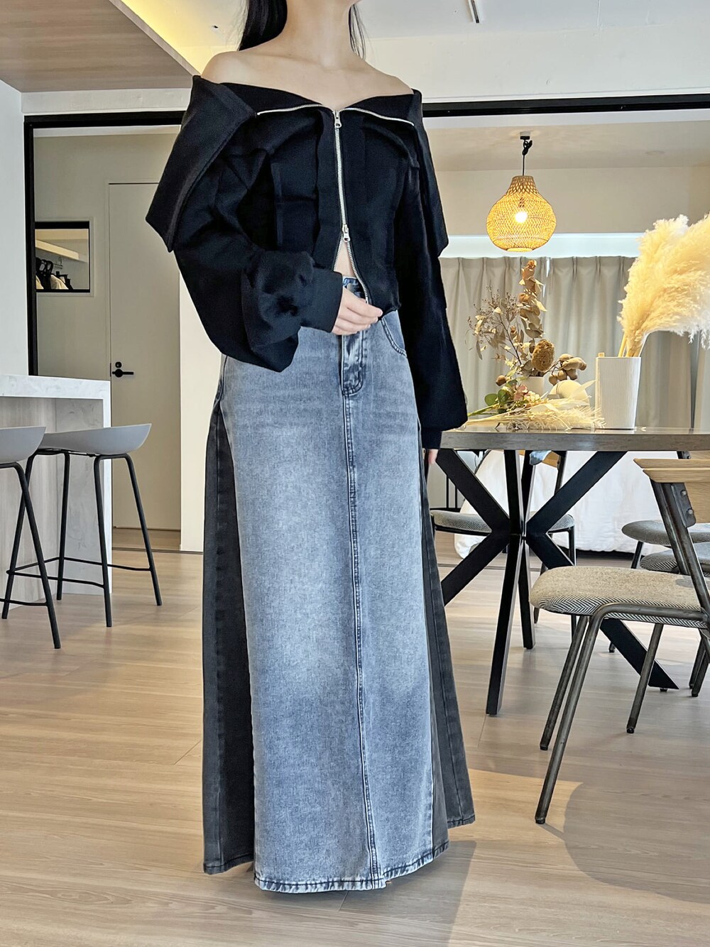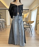 ご覧いただきありがとうございます* モードな雰囲気漂うカジュアルコーデ! 大きな衿が特徴のブルゾン型カットソートレーナーと キャッチーな配色が目を惹くデニムスカート♪ モノトーンのクールな印象を演出します。 ○ワイドカラージップアップトレーナー○ COLOR:BLACK SIZE:FREE 存在感のあるワイドカラーが目を惹く ジップアップのカットトップス。 ファスナーは上下開閉できるダブルジップで 様々な着こなしが楽しめるユニークな一枚。 フルクローズすれば衿の素材感が引き立つモードな雰囲気に、 開けてオフショルダーで着ればセンシュアルさがプラスされ印象チェンジに。 アクセントになったアウトシームは ざっくりとカットされたような表情を残しさらに個性的な仕上がりです。 ○サイド配色デニムフレアマキシスカート○ COLOR:BLUE SIZE:S サイドを別カラーのデニム生地で切り替えたマキシ丈デニムフレアスカート。 ずっしりとした重量感としっかり長めのマキシ丈がポイントです! 正面とサイドからの見え方が異なり、 1枚で様々に楽しめる一癖アイテム♪ カジュアルながらモードな雰囲気漂う高感度な1枚です。