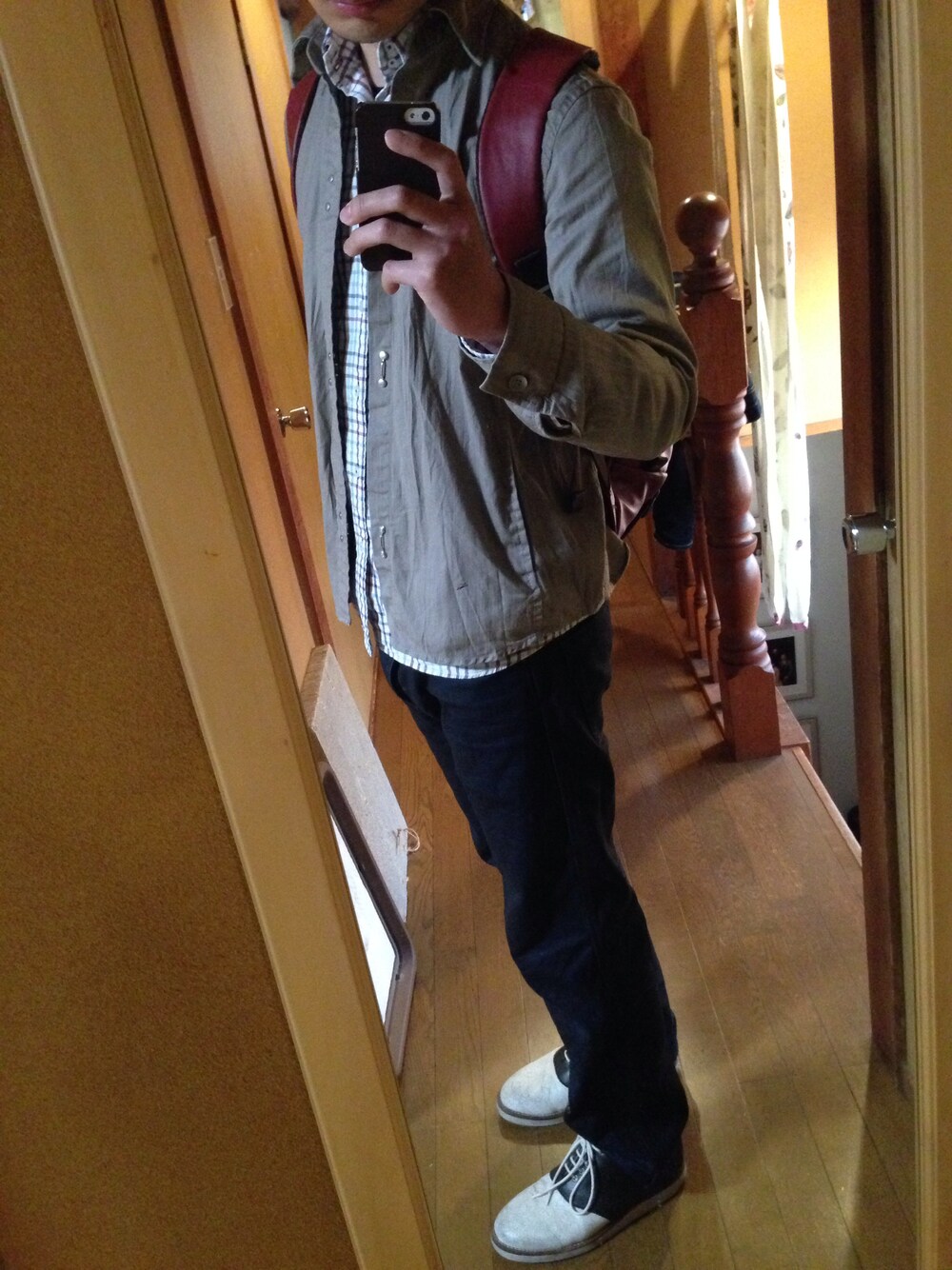 上着はボタンが3つしかない変な服です 靴は変なパリパリした革の靴です