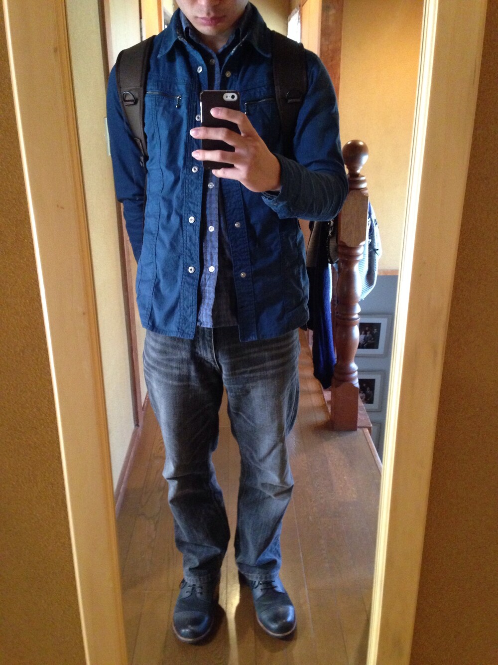 青いシャツに青いシャツ 青い靴 緑のリュックも信号だったら青