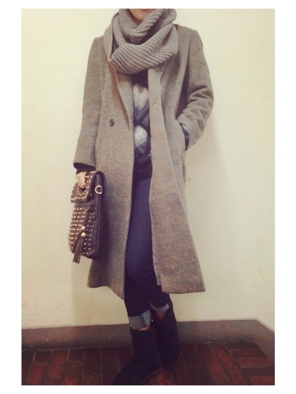 コート parisで購入 トップス EMODA デニム EMODA 靴 ノーブランド バッグ koreaで購入 スヌード ノーブランド シンプルな格好にスタッズバッグと ちょいおっきめのロングコートでアクセント! 足負傷中の為履ける靴が限られてるから 少しでもオシャレに見えるように頑張りました笑