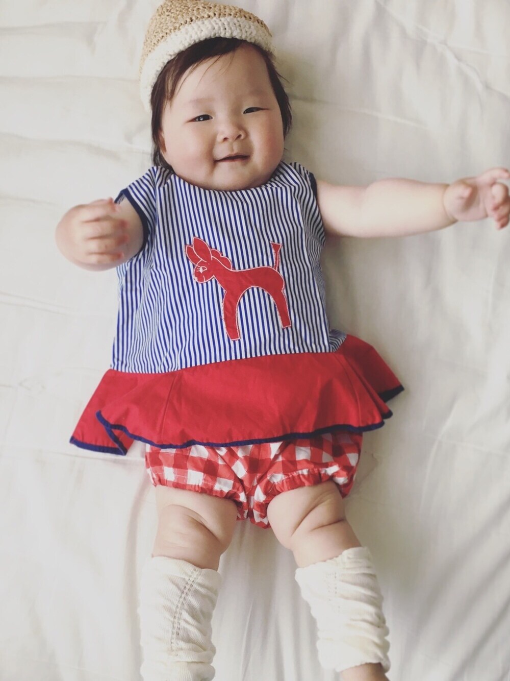 お気に入りの古着と 「ぼくとわたし」のまんまるパンツを合わせて。 むっちり手足。