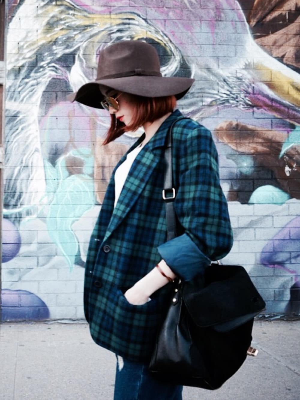 その他のテーラードジャケット、ブラウン系のハット、その他のサングラスを着用したレディースの春コーディネートの1枚目の写真