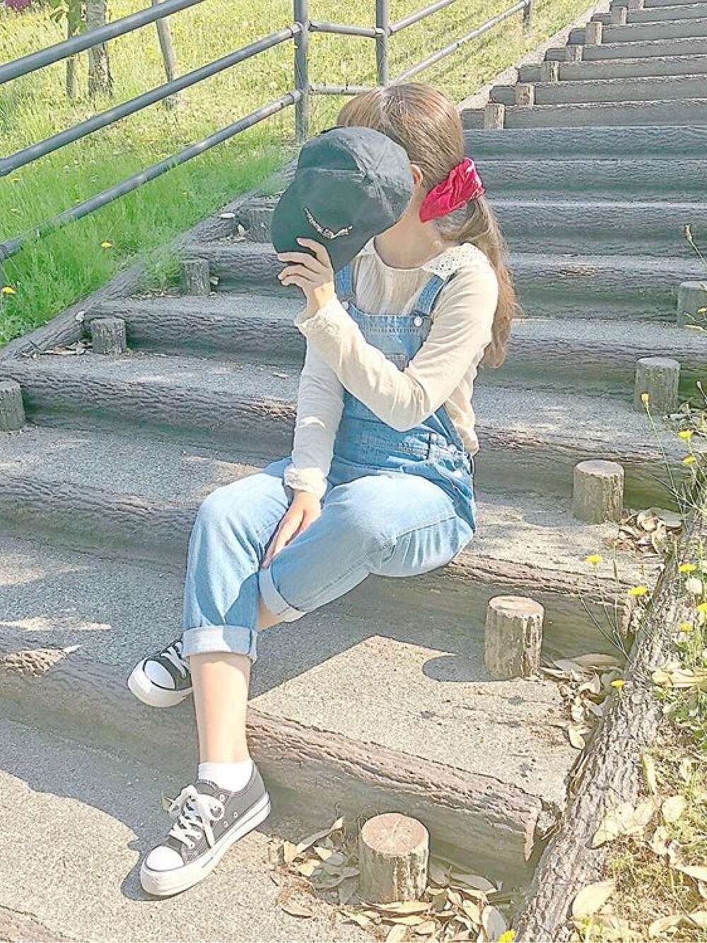 お気に入りのサロペットに100均の赤いバンダナを髪にぐるぐるっと巻いてみました☺️❤️