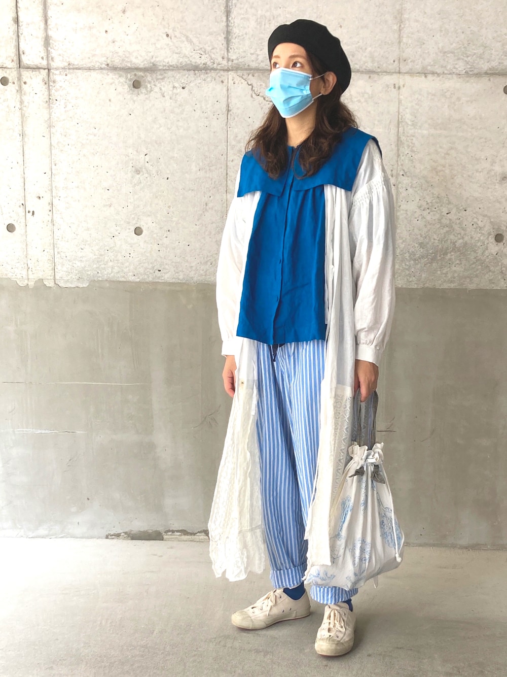 ブルー×ホワイト 肌寒いので、薄手のレースワンピースを羽織りに☺︎ 中のセーラー襟のブルーブラウスは半袖です