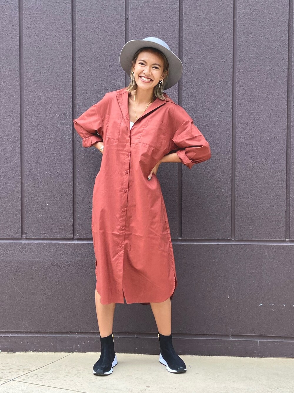 秋らしいボルドーのシャツワンピと ブラックのスニーカーを合わせて 大人かっこいいスタイリングに♪ Instagram→bona_b0127f
