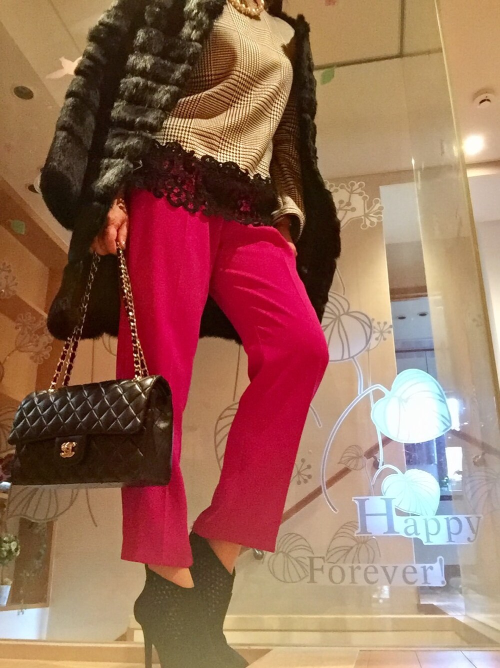 昼間のパーティースタイル。インパクトのある濃い目のピンクのパンツがポイント