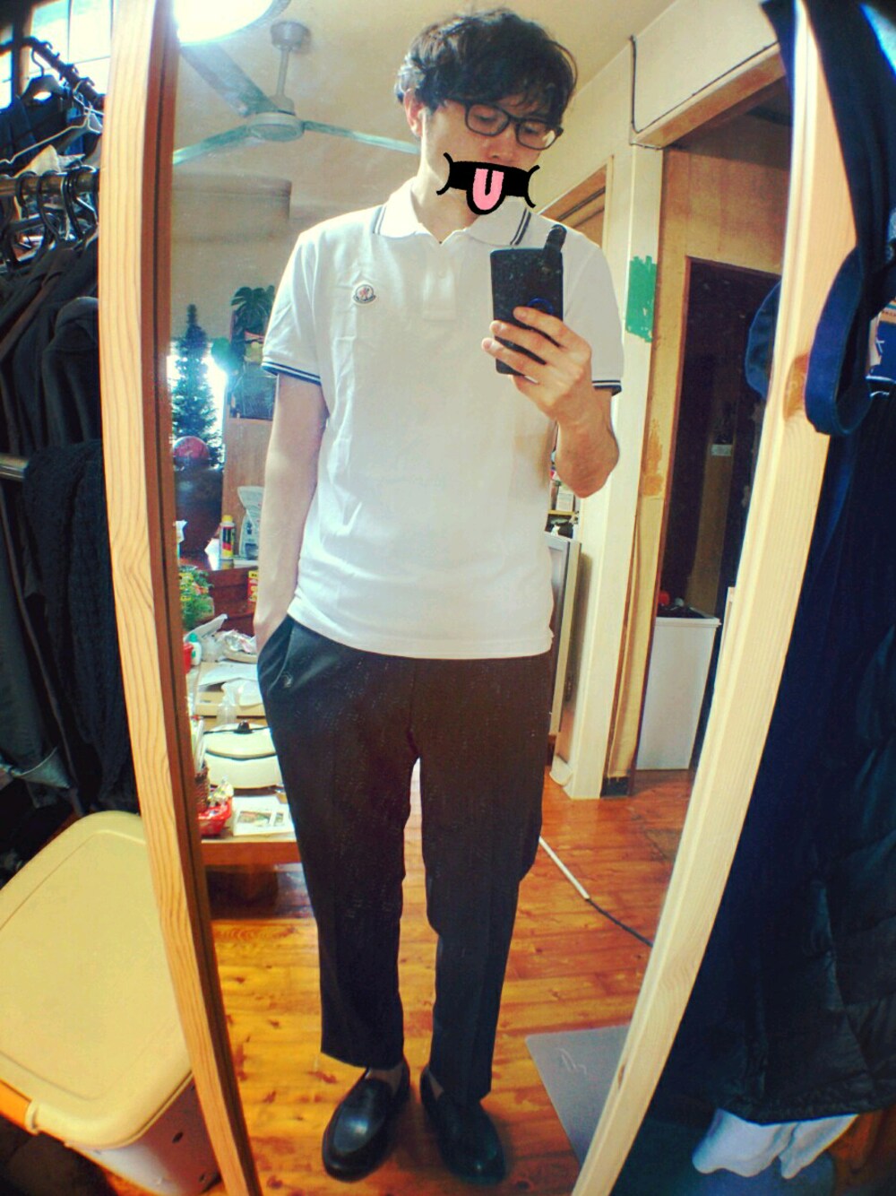 相変わらず雨なので、雨の日用に買っておいた合皮のラグソールローファーを合わせてみました🙌 白ポロシャツに、そこまでシルエットの細くないグレースラックス やっぱり自然光じゃないとちゃんと服の色が出ない😂グレースラックスなのにかなり暗いなぁ