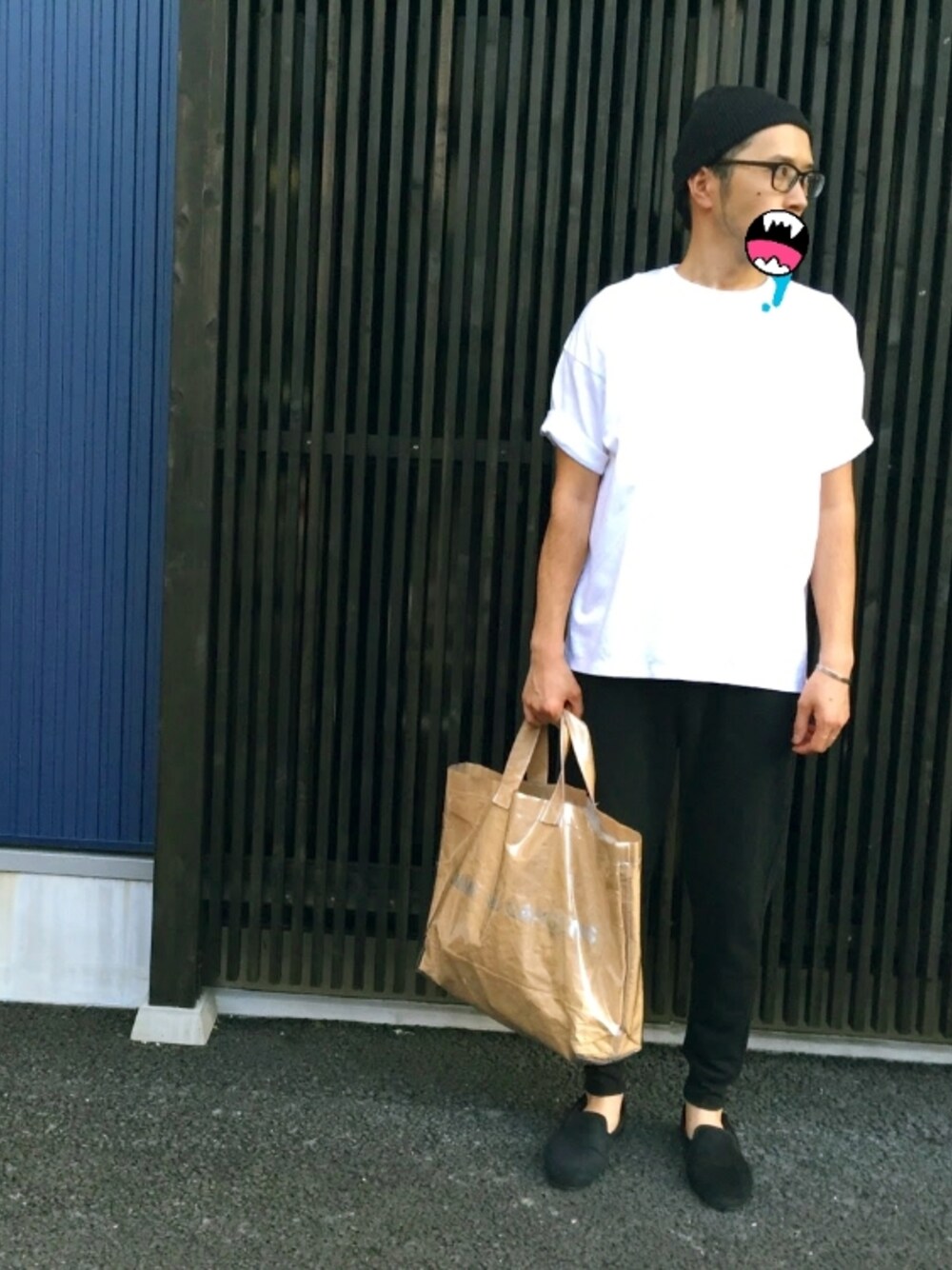 久しぶりに投稿です 外食だったのでお店の前にて、鶏専門で雉肉(キジ)なんかも出しているお店でした🐔 Tシャツはドロップショルダーで光沢感のあるビッグTに、レディースのジョガー、バッグは借り物でGARSONの紙袋にPVCで覆っているトートバッグです。これ雨の日なんかに最適ですね~