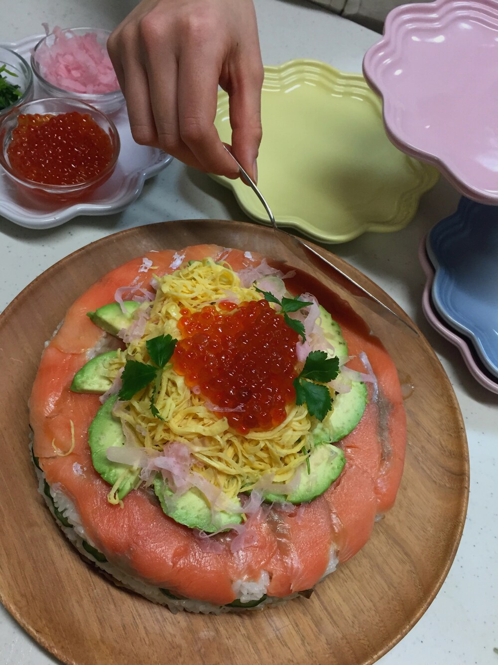 ひな祭り🎎 ケーキ寿司を作りました❣️ フラワーコレクションのお皿はひな祭りにも大活躍✨テーブルを華やかにしてくれます(*^^*)