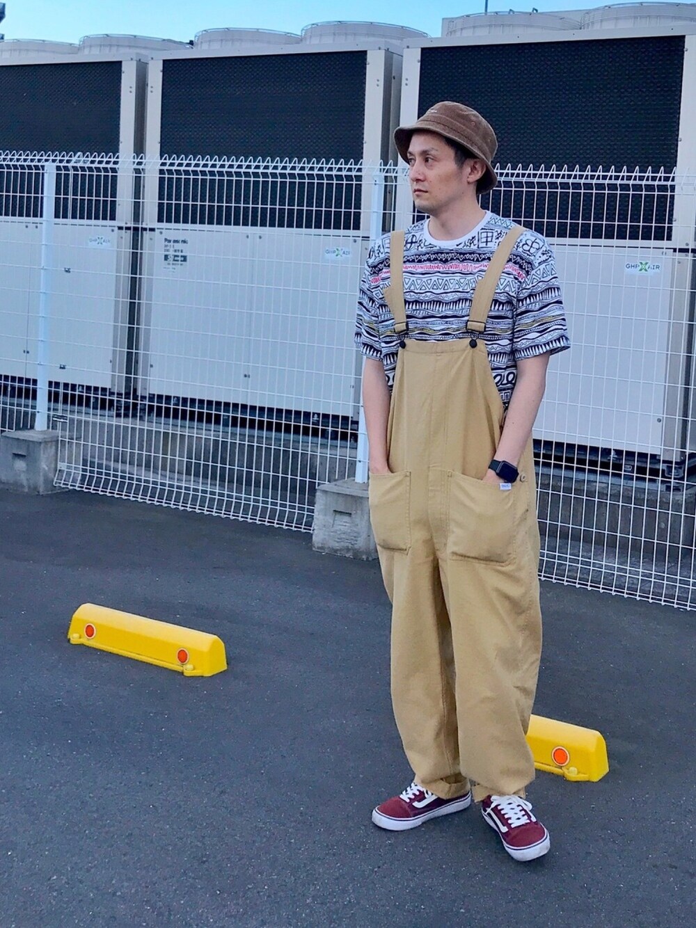 シンプルなオーバーオールにTENBOX (10匣) × GRAMICCIの柄Tシャツ👕 秋頃になったらコーデュロイ生地のオーバーオールもゲットしよう⤴️ クリーム系のVANSも欲しい👟