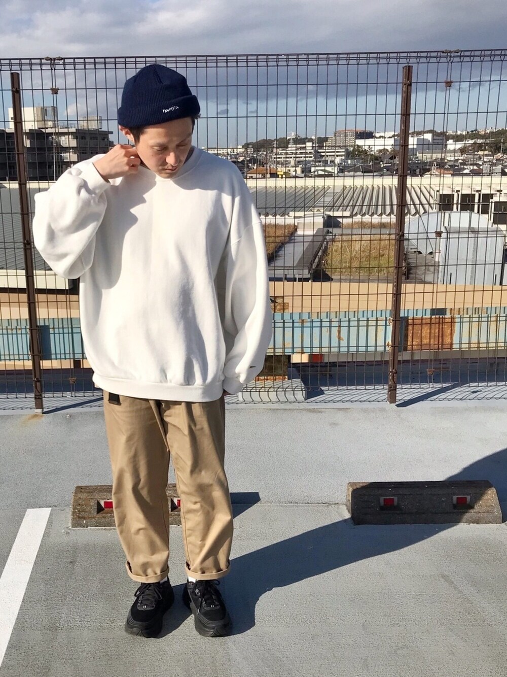 トップスを変更したスタイル👕 手首のロゴが良い感じの白スウェットはどんな格好にも合わせやすくて👍 シャツを羽織ってもいい感じ❗️