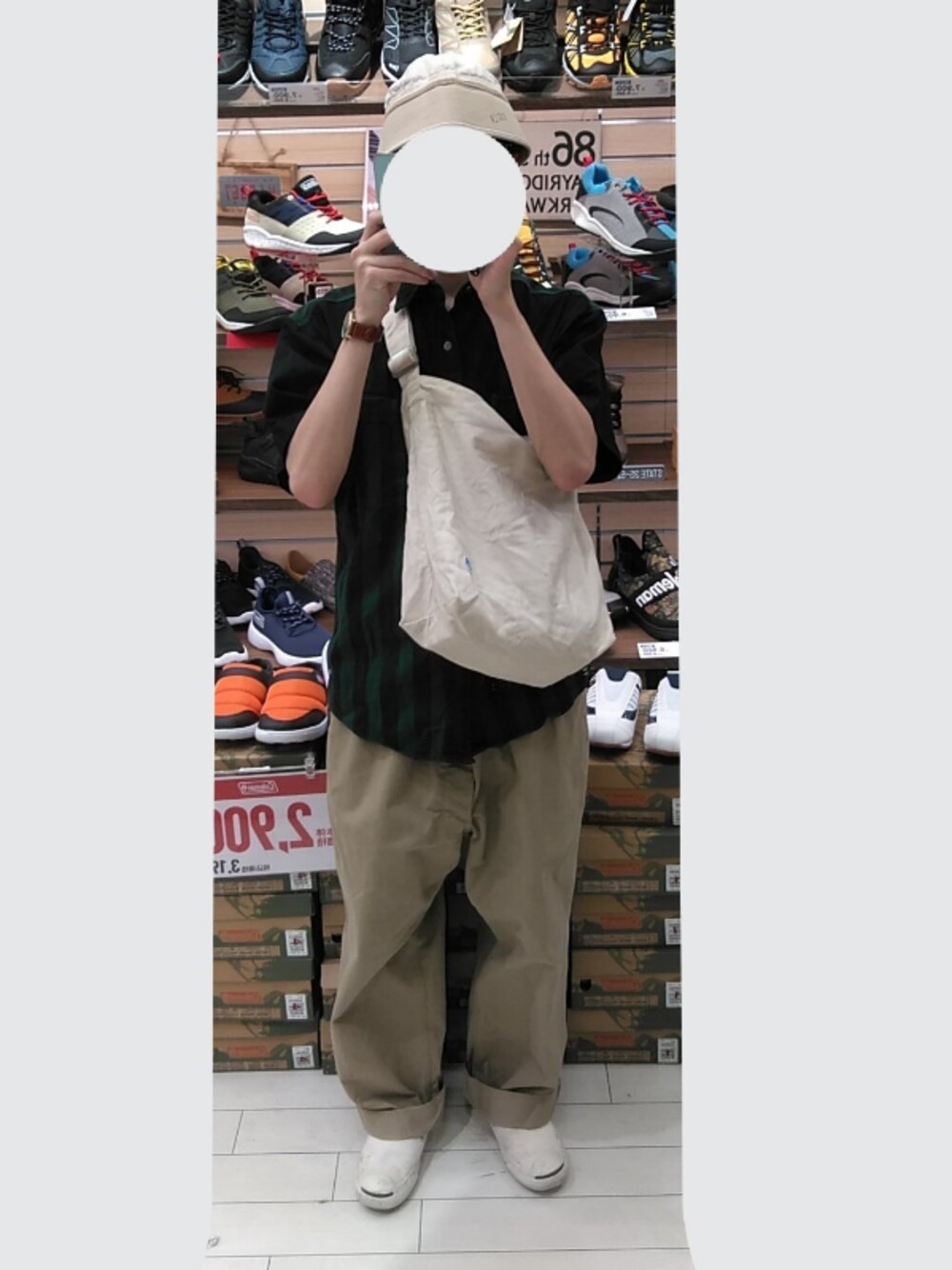 一人では全身像が撮れないので店舗の鏡を利用するしかないのです