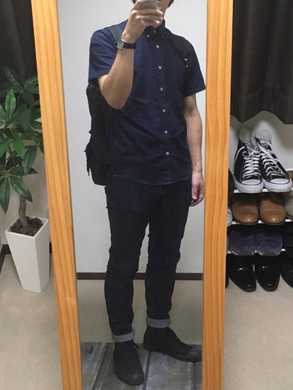おはようございます。 いつもいいね、SAVEありがとうございます。 ネイビーとブラックです。 青と黒の配色が好きです。 夏にこの配色で外にでるとすごく暑い。当たり前ですが。 気がつくと毎年買っているネイビーのシャツ。 今年はこれでした。 秋はビックシルエットの柄シャツが欲しいなと思ってます。