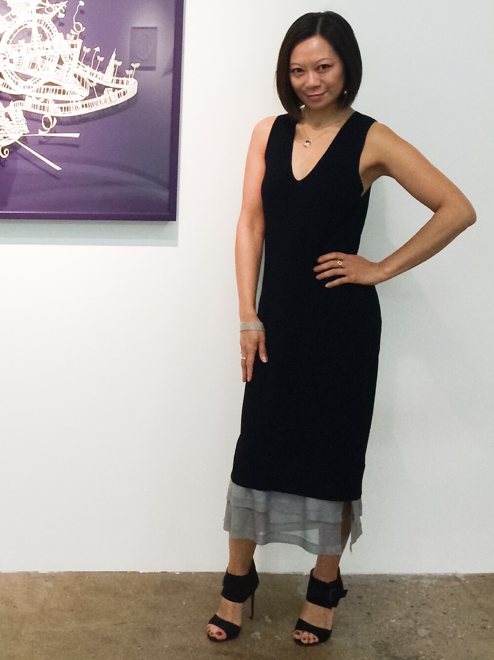 Minimalistic sleeveless evening dress with tiered silver ruffle bottom