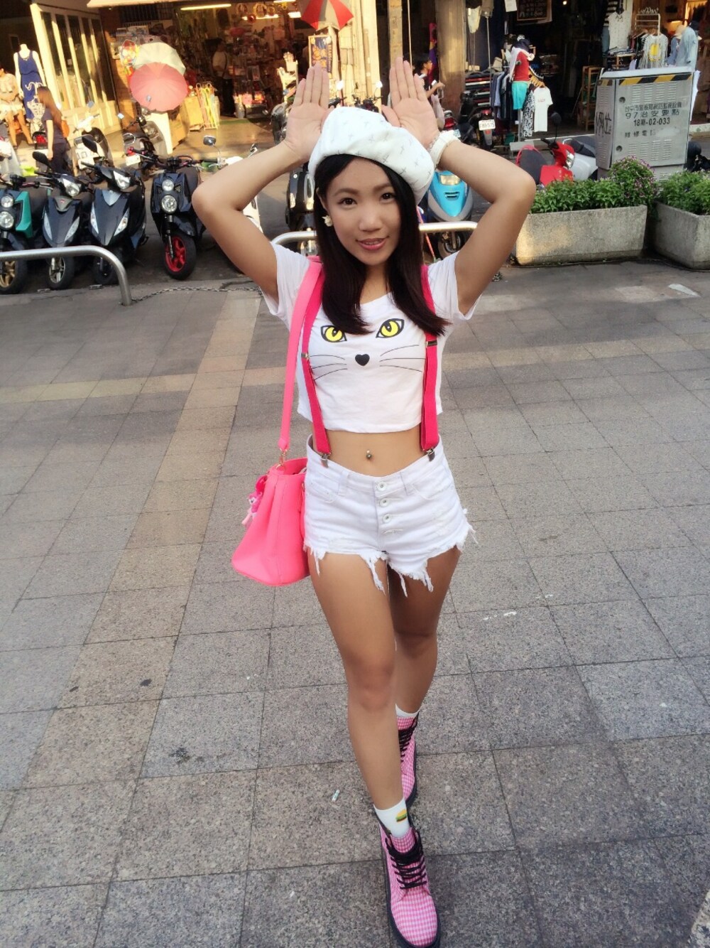 白帥帥粉嫩嫩腰內肉透氣風 ❤️❤️ 我個人膚色黑喜歡穿白色 這次的穿搭以白 桃色為主 😁😁😁 帽子衣服褲子襪子手錶耳環都是白色 吊帶包包鞋子是桃色搭配 喜歡這樣全身單一色再加一色搭配的感覺