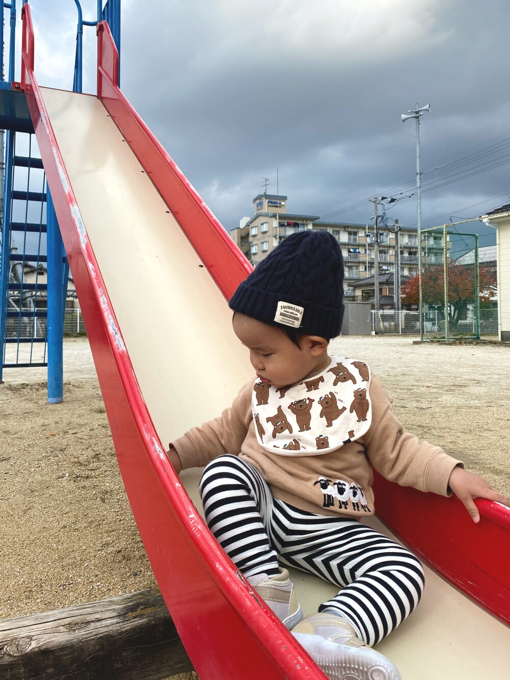 いつも、いいねありがとうございます✨ 買い物に行く前にちょっとだけ公園で遊びました🍁 まだ滑り台は上手くできないので座らせて滑るように母が動かす程度😅
