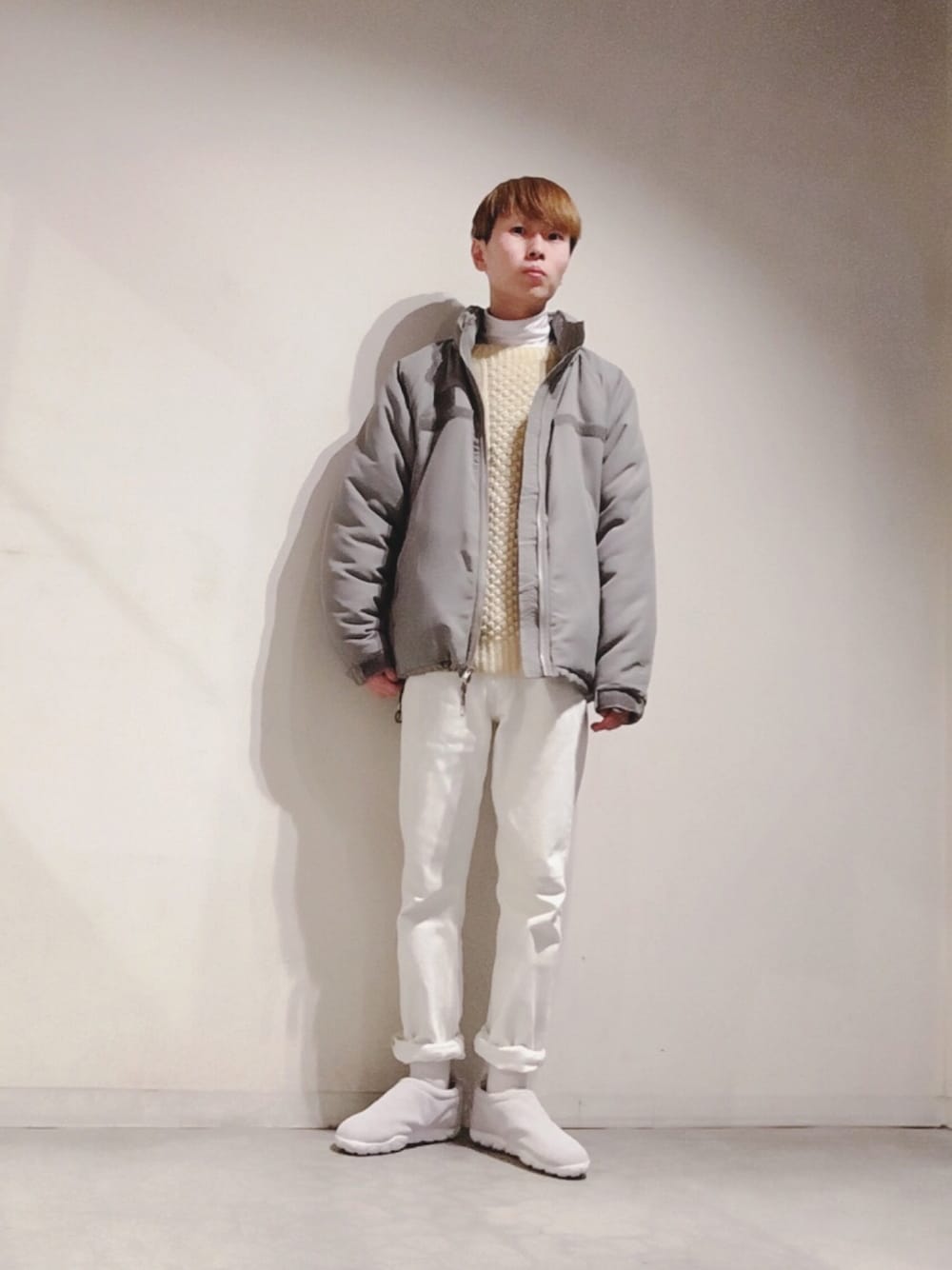 #168 マシュマロスーツ再登場。 前回のブラックに対し、 ホワイトでまとめてみる。 オールホワイトでは詰まらないので オフホワイトのアランニットを。 ジャケット、カットソー、スニーカー以外、古着です。