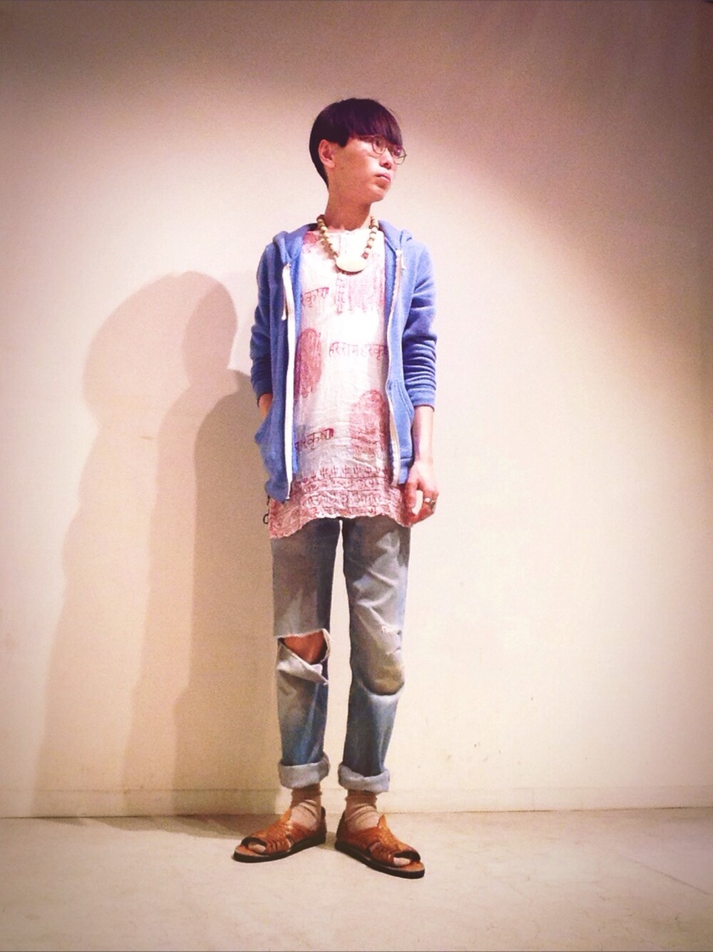 気温が上がってくるとついしたくなるエスニックテイスト。 チュニックとワンピースの間の子みたいなトップスは ZIPパーカーとデニムパンツで街着に馴染ませます。 メガネやサンダル×ソックスで今年らしさも。 チュニック、メガネ、サンダル以外、古着です。