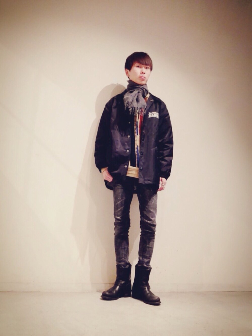 KANGOLコーチジャケット、COOGI(風)セータときて 90'sストリートな感じにしようと思い、 スニーカーにしようとしたところ、 このエンジニアブーツと目が合い、 出掛ける直前に変更。 忠実に再現するだけが洋服の醍醐味では無いですしね。 パンツ以外、古着です。
