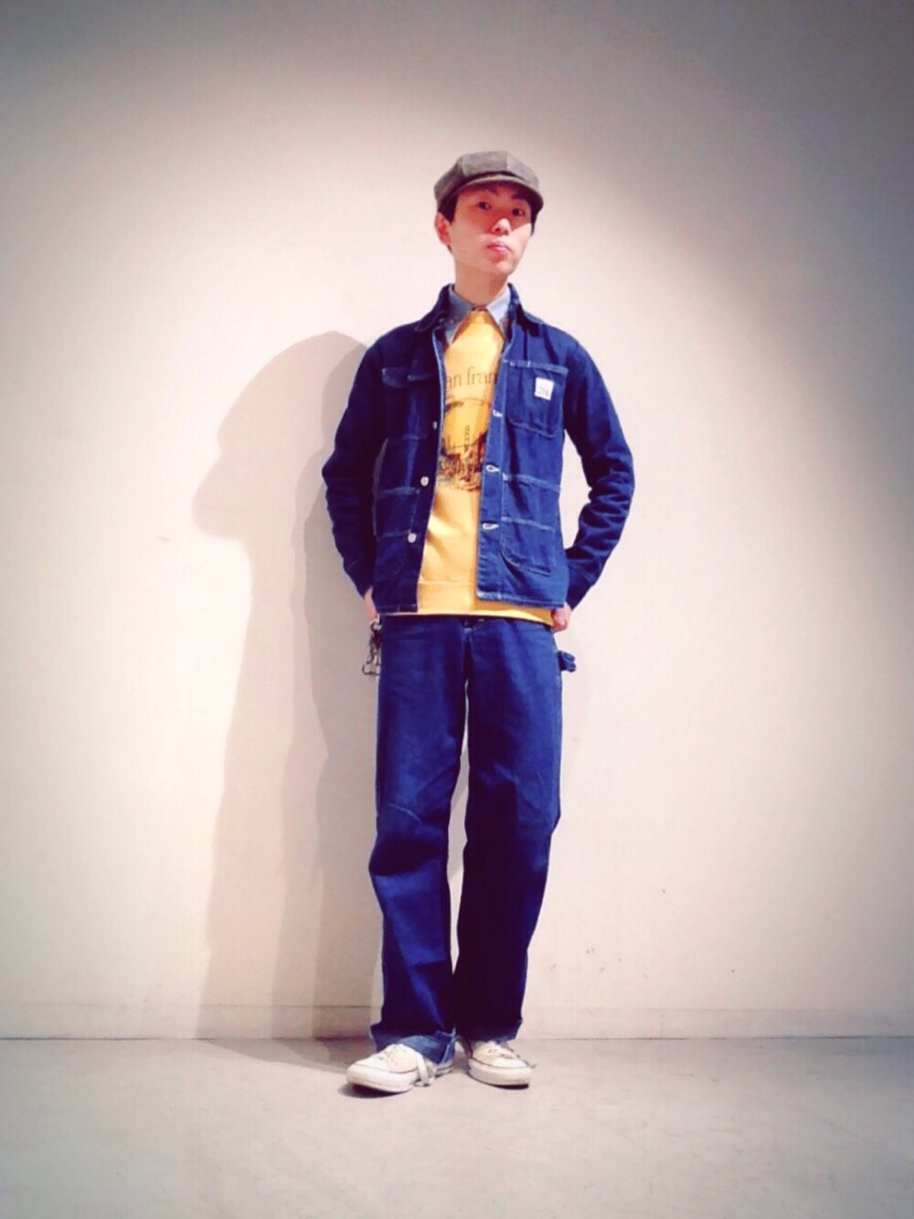 POINTERデニム上下。 これはSet upと呼んで良いのかわかりませんが、 まぁ、そうしておきましょう。 今日はそれをワークテイストに。 古着を仕事にしてすぐの頃、 最初に夢中になったのがワーク物でした。 自分には無い無骨な漢像に想いを馳せていました。 キャスケット以外、古着です。