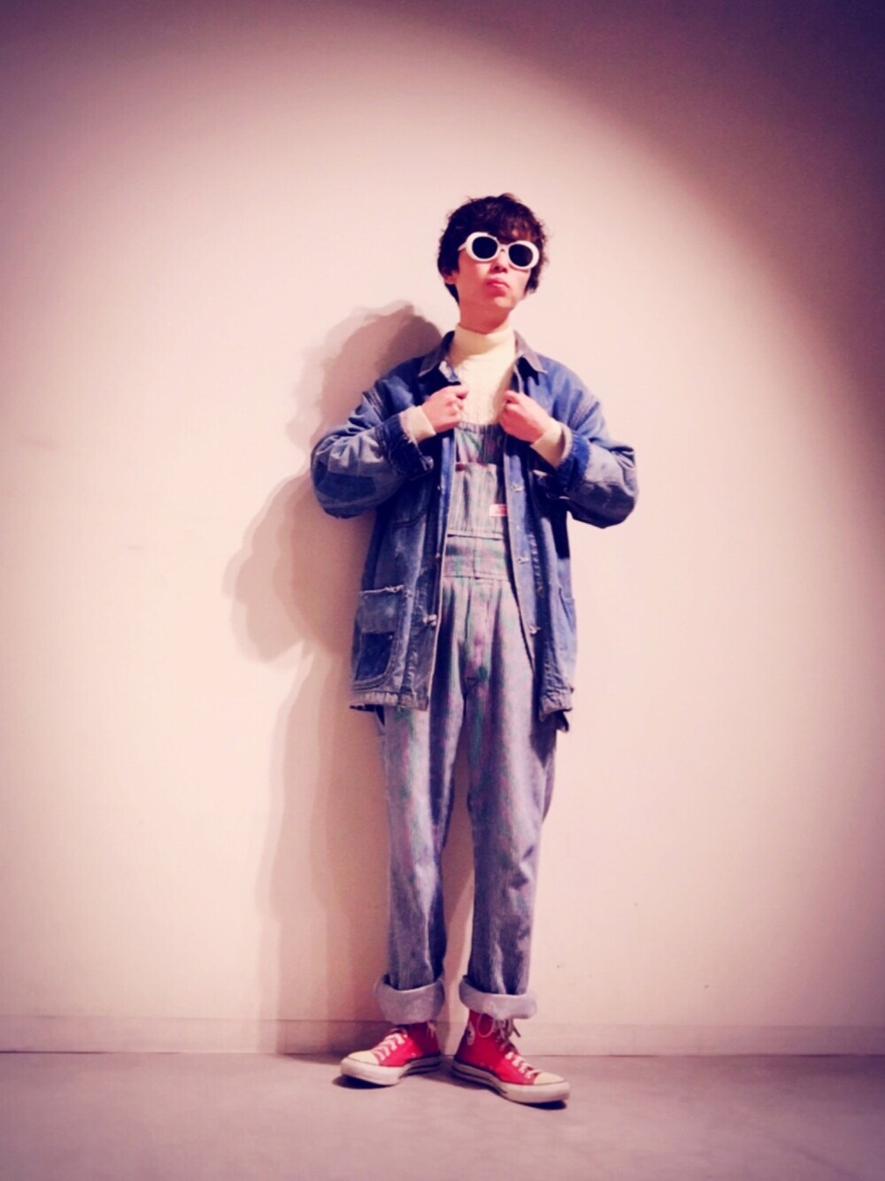デニムのカバーオールにヒッコリーのオーバーオールで 珍しくワークな感じを。 相性の良いレッドを差し色として。 オーバーオール、サングラス、スニーカー以外、古着です。
