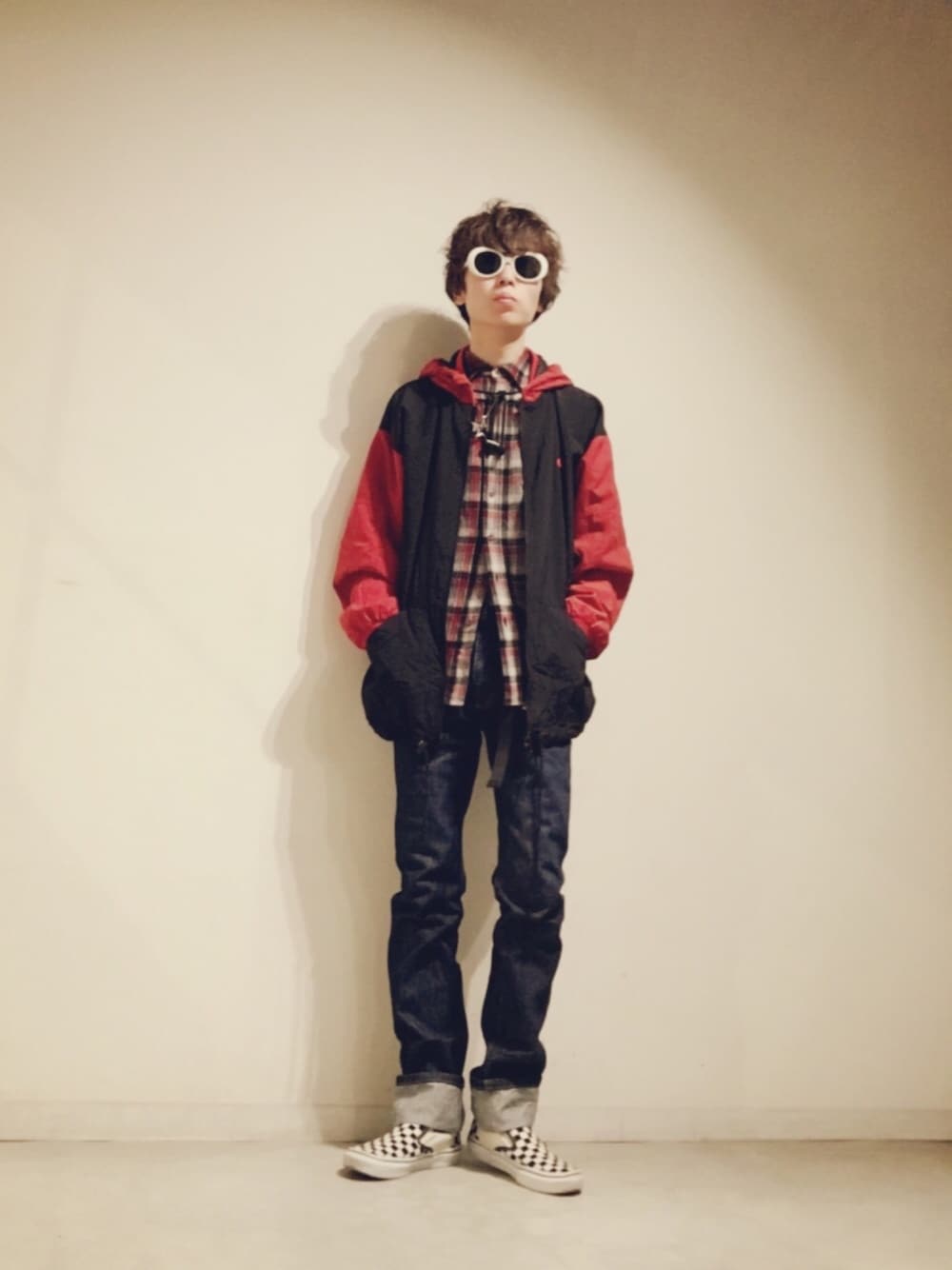 #7 ジャケットのフード部のアジャスター、 ウールシャツのボタンの留め方で Aラインと昔のストリートスタイル意識。 開いた部分からガチャベルト見せ。 サングラス、スニーカー以外、古着です。