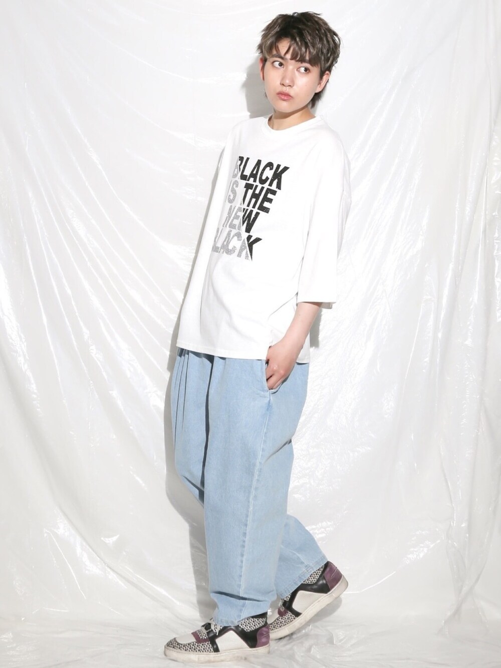 ラメのロゴがインパクトのある白Tシャツにデニムバギーパンツで楽ちんコーデ Instagram@boyshe_official