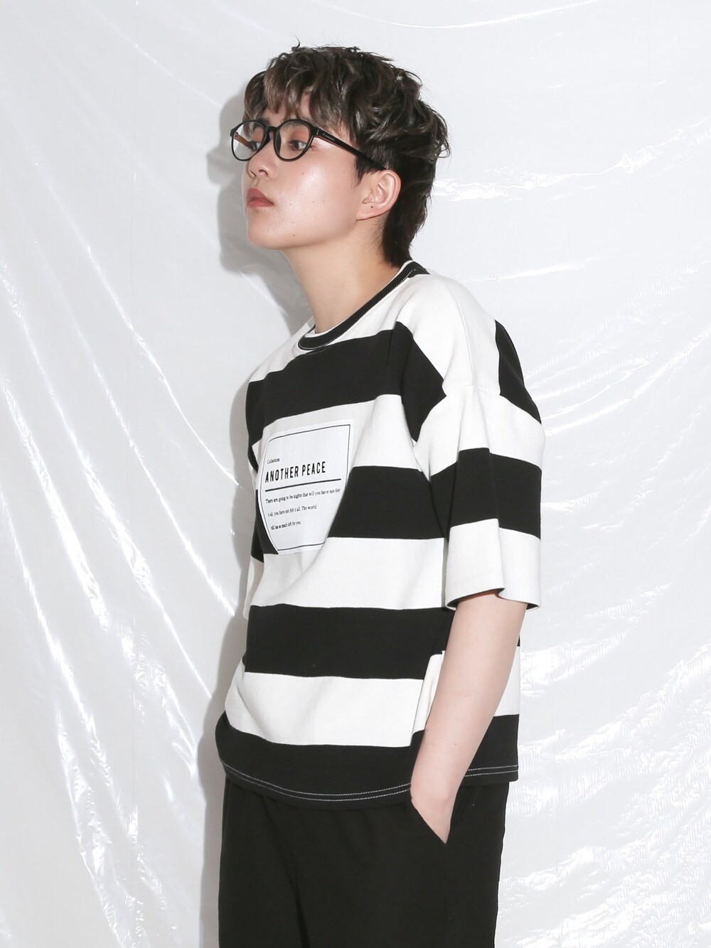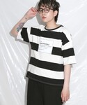 BOYSHEのTシャツ/カットソー「PEACE ビッグボーダー ショート丈Tシャツ ブラック」を使ったコーディネート
