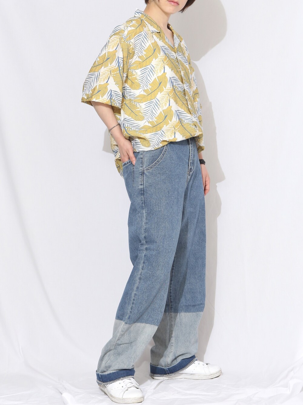 ヤシの木柄のシャツは冷んやりしたソフトな肌触りなので着心地が良いです。 配色デニムパンツは薄めの生地感なので夏でも涼しく着られます。 身長:158cm 体重:47kg Instagram@boyshe_official